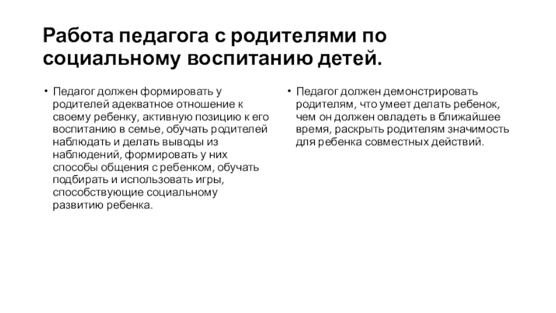 Педагог должен демонстрировать родителям, что умеет делать ребенок, чем он должен овладеть в ближайшее время, раскрыть родителям значимость для ребенка совместных действий.