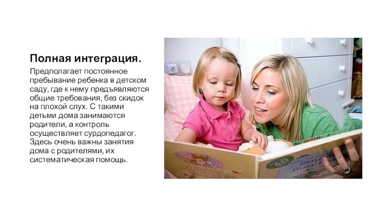 По ее мнению, посещение глухим ребенком массового детского сада возможно при условии систематических занятий родителей, хорошего протезирования детей слуховыми аппаратами, наличия у них устной речи.
