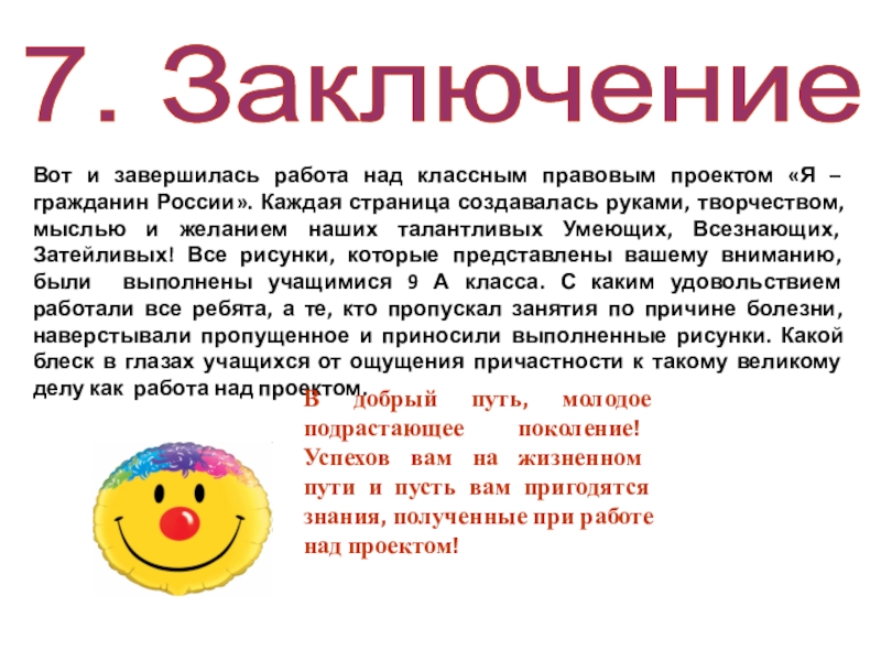 – гражданин России». Каждая страница создавалась руками, творчеством, мыслью и желанием наших талантливых Умеющих, Всезнающих, Затейливых! Все рисунки, которые представлены вашему вниманию, были выполнены учащимися 9 А класса. С каким удовольствием работали все ребята, а те, кто пропускал занятия по причине болезни, наверстывали пропущенное и приносили выполненные рисунки. Какой блеск в глазах учащихся от ощущения причастности к такому великому делу как работа над проектом.