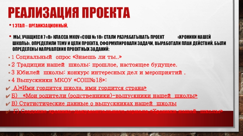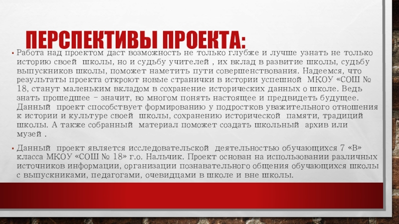 Данный проект является исследовательской деятельностью обучающихся 7 «В» класса МКОУ «СОШ № 18» г.о. Нальчик. Проект основан на использовании различных источников информации, организации познавательного общения обучающихся школы с выпускниками, педагогами, очевидцами в школе и вне школы.