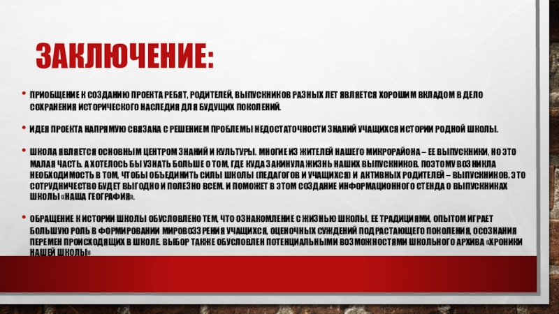 Обращение к истории школы обусловлено тем, что ознакомление с жизнью школы, ее традициями, опытом играет большую роль в формировании мировоззрения учащихся, оценочных суждений подрастающего поколения, осознания перемен происходящих в школе. Выбор также обусловлен потенциальными возможностями школьного архива «Хроники нашей школы»