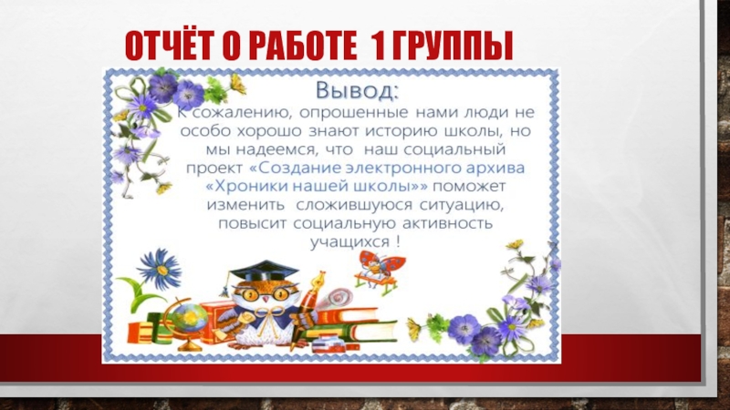 людьми, у них появилась уверенность в себе. Особенно приятно будет увидеть результаты своего труда. Участники проекта надеются, что создание архива «Хроники нашей школы» станет одной из школьных традиций, будет ежегодно пополняться новыми документальными материалами и заинтересует не только учащихся, но и их родителей, бывших выпускников, гостей и друзей.