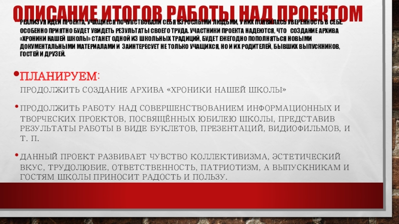 Данный проект развивает чувство коллективизма, эстетический вкус, трудолюбие, ответственность, патриотизм, а выпускникам и гостям школы приносит радость и пользу.