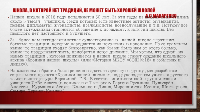 На классном собрании было решено создать творческую группу для разработки социального проекта «Хроники нашей школы», под руководством учителя русского языка и литературы Варавиной Г.В. В состав инициативной группы вошли учащиеся 7 «В» класса (в количестве 7 человек: Гергова Русалина, Пушкарёв Алексей, Курманова Асият, Калмыкова Диана, Мирошникова Ксения, Шигалугова Самира, Хуранов Каплан.)