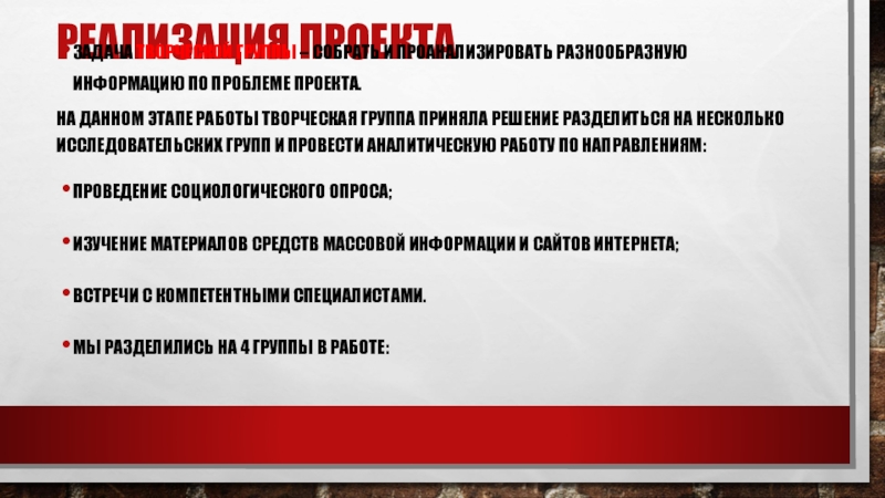 На данном этапе работы творческая группа приняла решение разделиться на несколько исследовательских групп и провести аналитическую работу по направлениям: