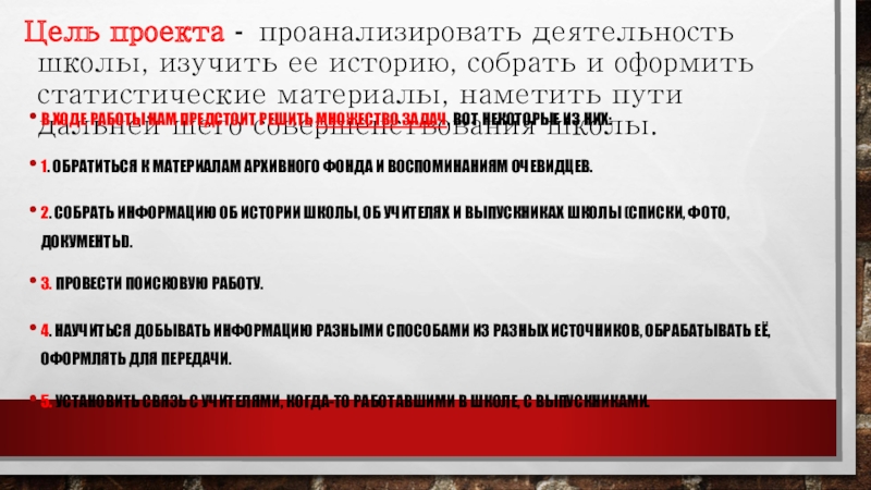 Слайд 5Цель проекта - проанализировать деятельность школы, изучить ее историю, собрать и оформить