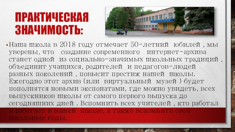 уверены, что создание современного интернет-архива станет одной из социально-значимых школьных традиций, объединит учащихся, родителей и педагогов-людей разных поколений, повысит престиж нашей школы. Ежегодно этот архив (или виртуальный музей) будет пополнятся новыми экспонатами, где можно увидеть, всех выпускников школы от самого первого выпуска до сегодняшних дней. Вспомнить всех учителей, кто работал и работает в нашей школе, а также вспомнить свои школьные годы.