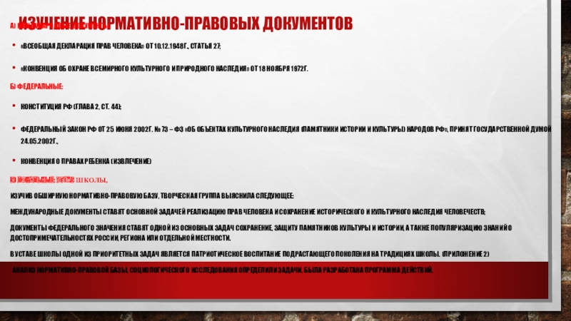 Международные документы ставят основной задачей реализацию прав человека и сохранение исторического и культурного наследия человечеств;