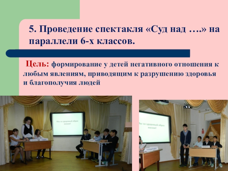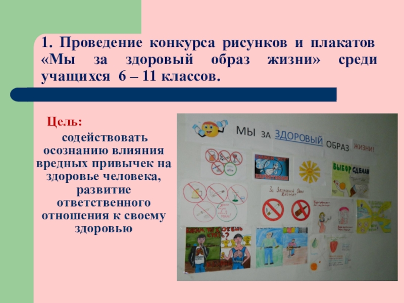 1. Проведение конкурса рисунков и плакатов «Мы за здоровый образ жизни» среди учащихся 6 – 11 классов.