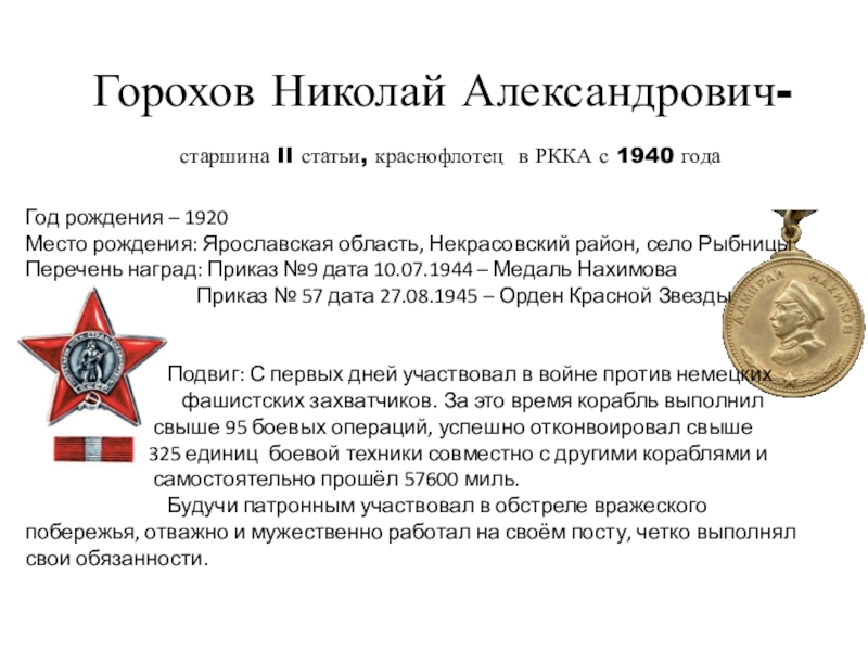 Перечень наград: Приказ №9 дата 10.07.1944 – Медаль Нахимова