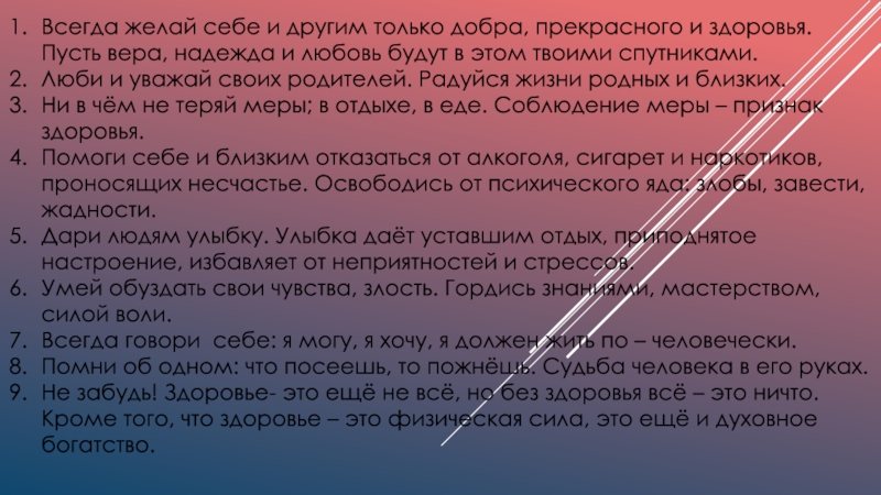 Слайд 35Всегда желай себе и другим только добра, прекрасного и здоровья. Пусть