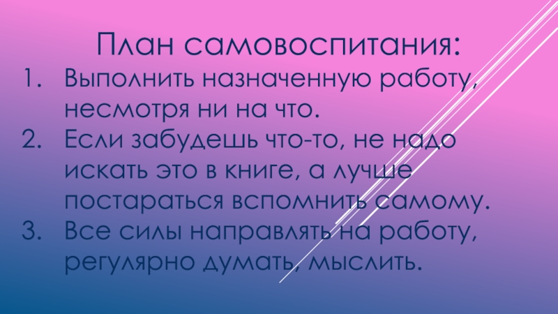 Слайд 8План самовоспитания: