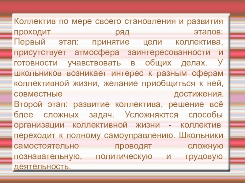 Слайд 9Коллектив по мере своего становления и развития проходит ряд этапов: