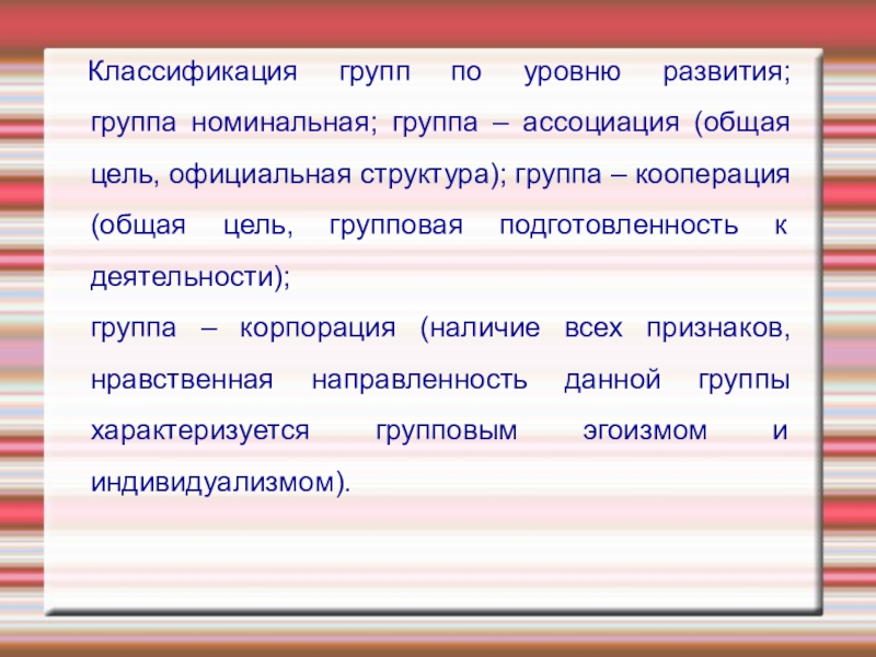 группа ‒ корпорация (наличие всех признаков, нравственная направленность данной группы характеризуется групповым эгоизмом и индивидуализмом).
