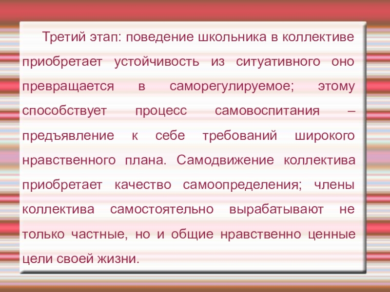 Слайд 10 Третий этап: поведение школьника в коллективе приобретает устойчивость