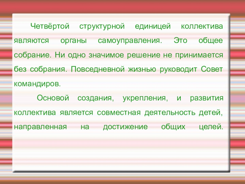 Слайд 6 Четвёртой структурной единицей коллектива являются органы самоуправления. Это общее собрание.