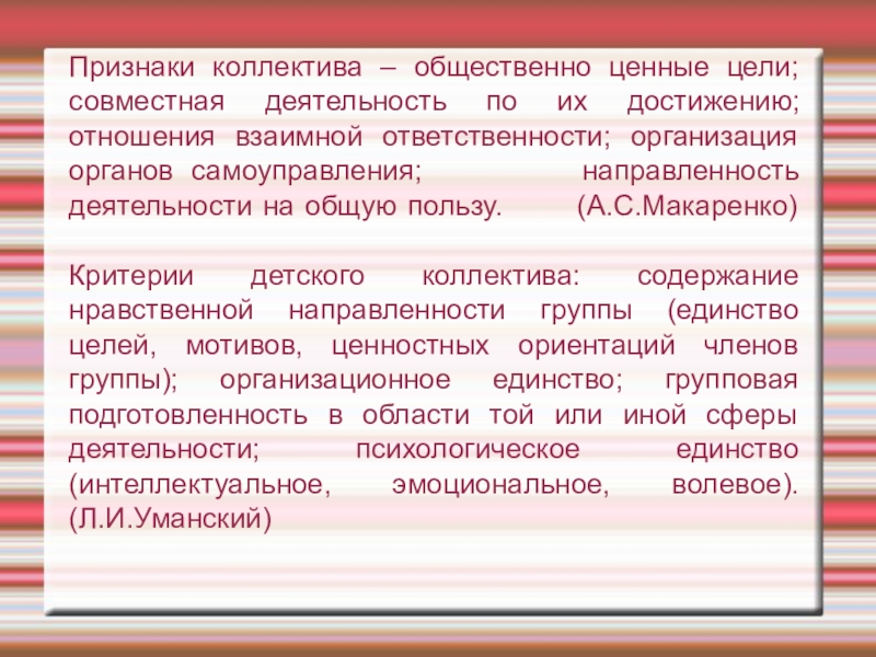 Критерии детского коллектива: содержание нравственной направленности группы (единство целей, мотивов, ценностных ориентаций членов группы); организационное единство; групповая подготовленность в области той или иной сферы деятельности; психологическое единство (интеллектуальное, эмоциональное, волевое). (Л.И.Уманский)