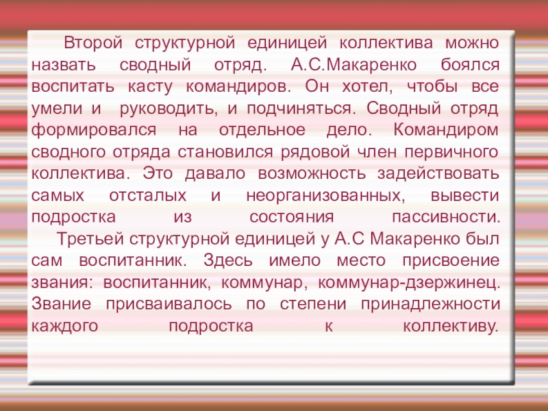 Слайд 5 Второй структурной единицей коллектива можно назвать сводный отряд. А.С.Макаренко