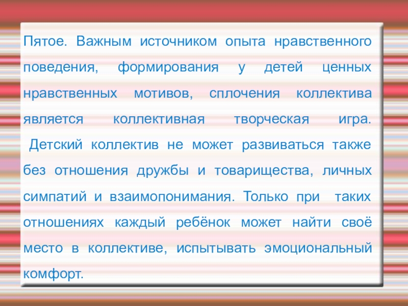 Слайд 8Пятое. Важным источником опыта нравственного поведения, формирования у детей ценных нравственных