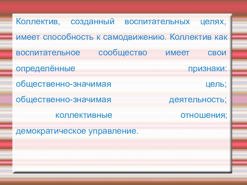Слайд 11Коллектив, созданный воспитательных целях, имеет способность к самодвижению. Коллектив как воспитательное
