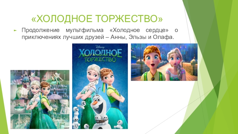 «ХОЛОДНОЕ ТОРЖЕСТВО» Продолжение мультфильма «Холодное сердце» о приключениях лучших друзей – Анны, Эльзы и Олафа.