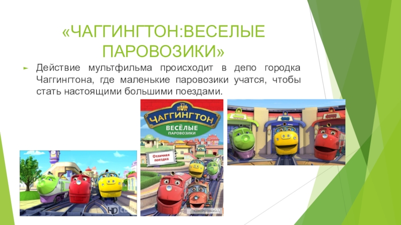 «ЧАГГИНГТОН:ВЕСЕЛЫЕ ПАРОВОЗИКИ»Действие мультфильма происходит в депо городка Чаггингтона, где маленькие паровозики учатся, чтобы стать настоящими большими поездами.