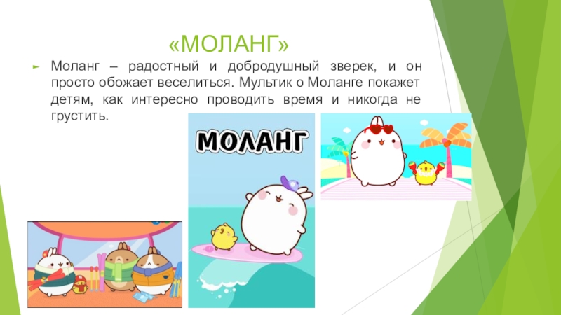 «МОЛАНГ»Моланг – радостный и добродушный зверек, и он просто обожает веселиться. Мультик о Моланге покажет детям, как