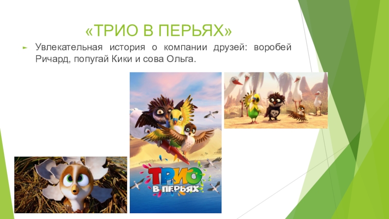 «ТРИО В ПЕРЬЯХ»Увлекательная история о компании друзей: воробей Ричард, попугай Кики и сова Ольга.