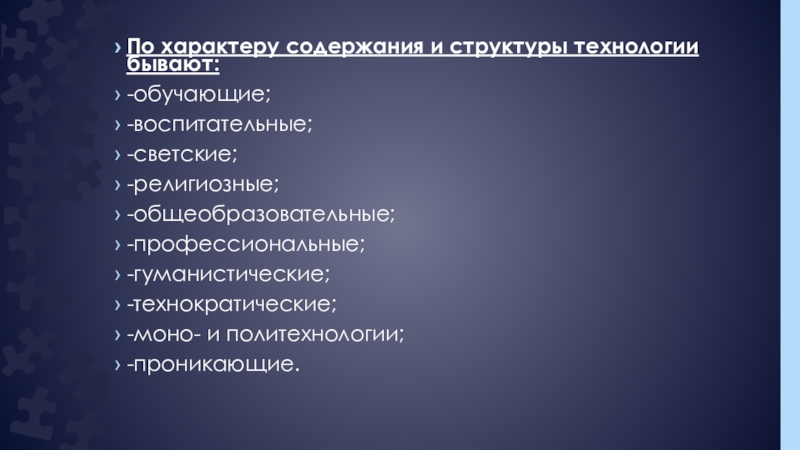 По характеру содержания и структуры технологии бывают:-обучающие;-воспитательные;-светские;-религиозные;-общеобразовательные;-профессиональные;-гуманистические;-технократические;-моно- и политехнологии;-проникающие.