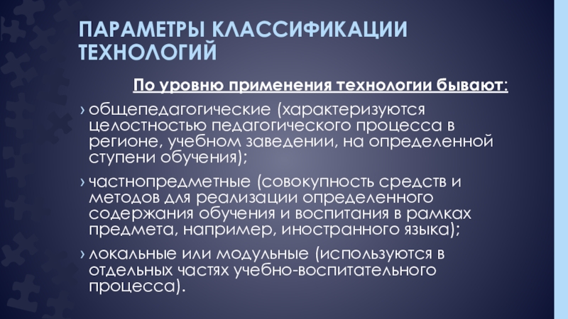 ПАРАМЕТРЫ КЛАССИФИКАЦИИ ТЕХНОЛОГИЙ      По уровню применения технологии бывают:общепедагогические (характеризуются целостностью педагогического процесса