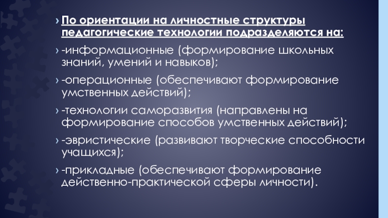 По ориентации на личностные структуры педагогические технологии подразделяются на:-информационные (формирование школьных знаний, умений и навыков);-операционные (обеспечивают формирование