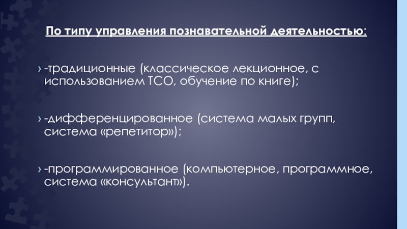 По типу управления познавательной деятельностью:-традиционные (классическое лекционное, с использованием ТСО, обучение по книге);-дифференцированное (система малых