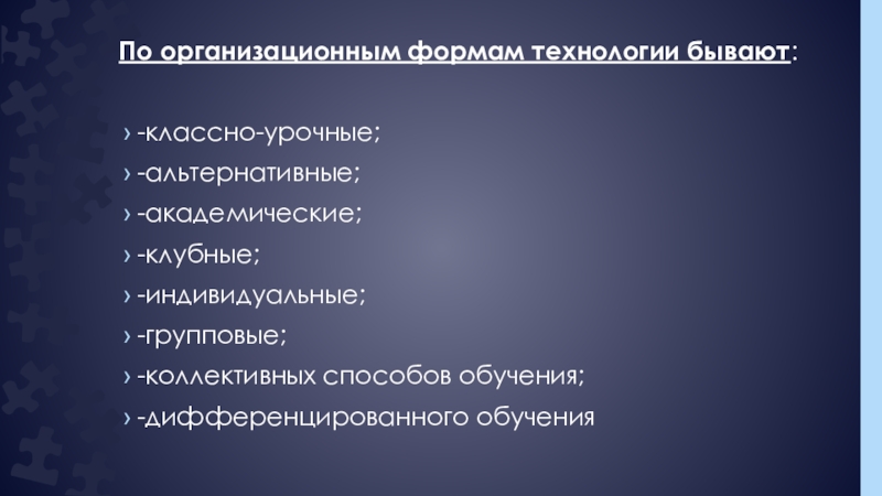 По организационным формам технологии бывают:-классно-урочные;-альтернативные;-академические;-клубные;-индивидуальные;-групповые;-коллективных способов обучения;-дифференцированного обучения