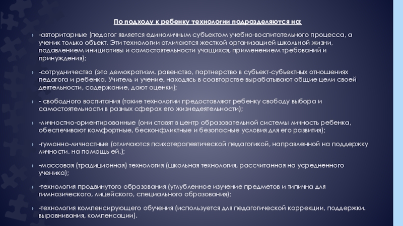 -авторитарные (педагог является единоличным субъектом учебно-воспитательного процесса, а ученик только объект. Эти технологии отличаются жесткой организацией школьной жизни, подавлением инициативы и самостоятельности учащихся, применением требований и принуждения);