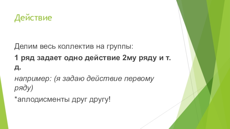 ДействиеДелим весь коллектив на группы:1 ряд задает одно действие 2му ряду и т.д.например: (я задаю действие первому