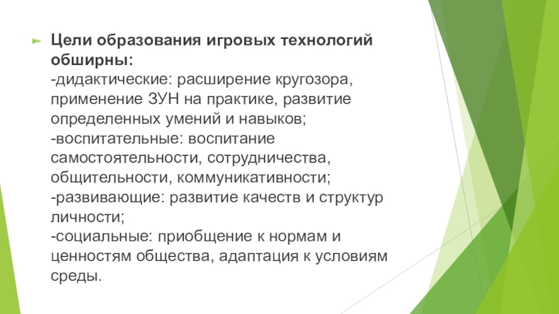 Слайд 7Цели образования игровых технологий обширны: -дидактические: расширение кругозора, применение ЗУН на практике,