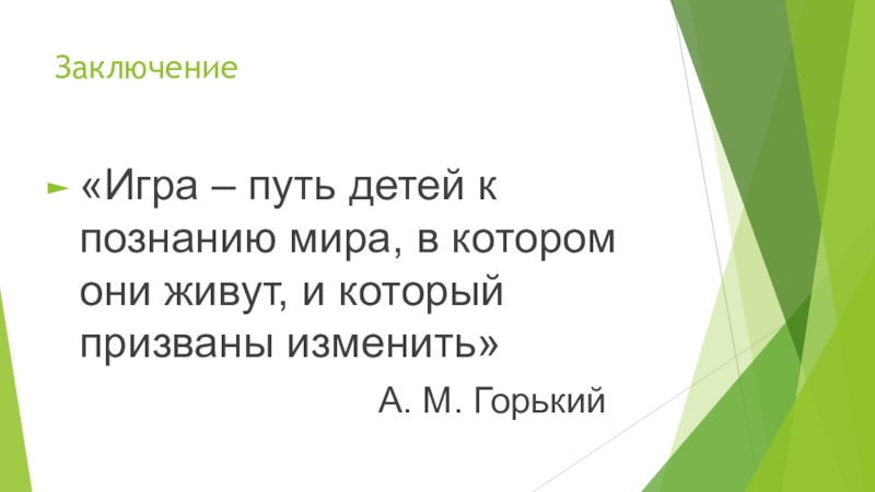 Заключение«Игра – путь детей к познанию мира, в котором они живут, и который призваны изменить»