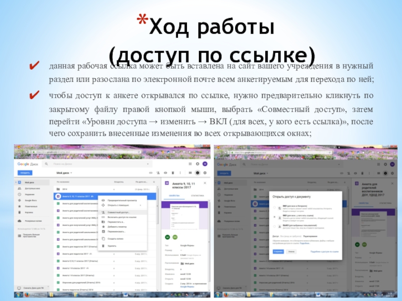 чтобы доступ к анкете открывался по ссылке, нужно предварительно кликнуть по закрытому файлу правой кнопкой мыши, выбрать «Совместный доступ», затем перейти «Уровни доступа изменить ВКЛ (для всех, у кого есть ссылка)», после чего сохранить внесенные изменения во всех открывающихся окнах;
