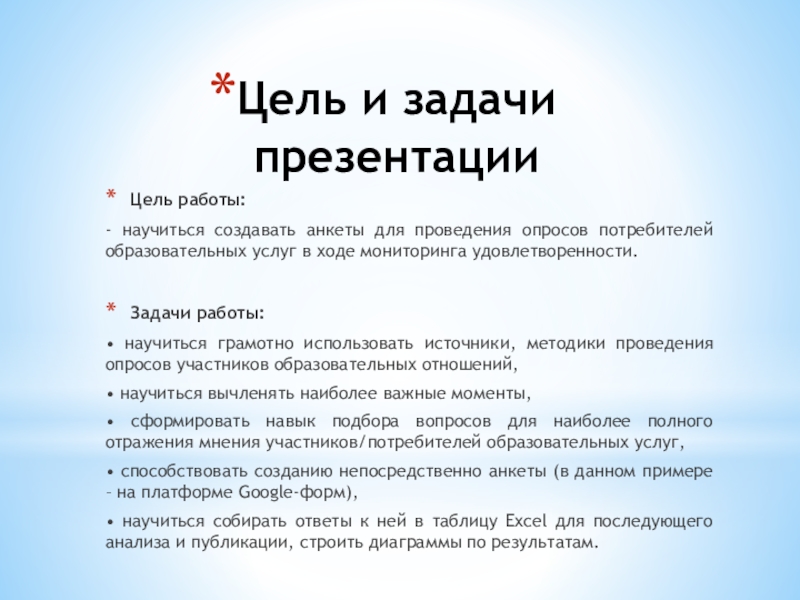 • сформировать навык подбора вопросов для наиболее полного отражения мнения участников/потребителей образовательных услуг,