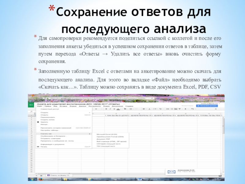Заполненную таблицу Excel с ответами на анкетирование можно скачать для последующего анализа. Для этого во вкладке «Файл» необходимо выбрать «Скачать как…». Таблицу можно сохранять в виде документа Excel, PDF, CSV и т.д.