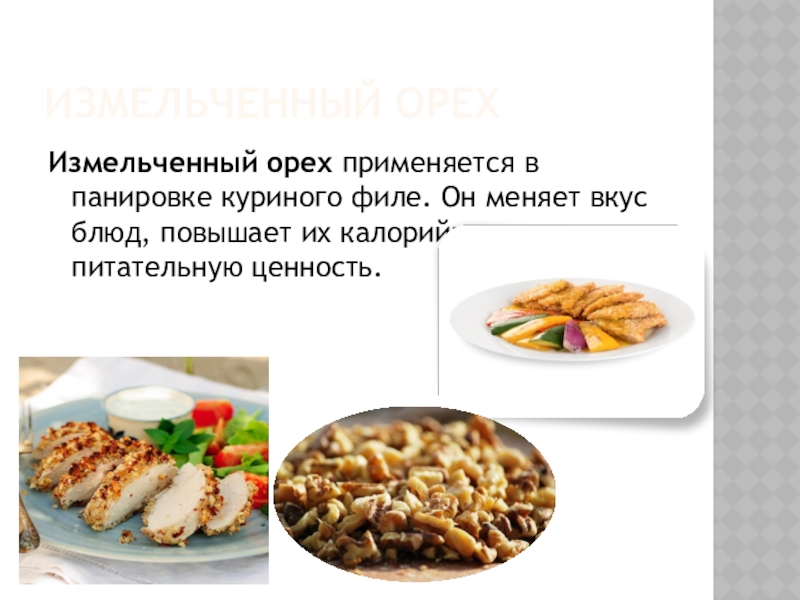 Измельченный орех применяется в панировке куриного филе. Он меняет вкус блюд,