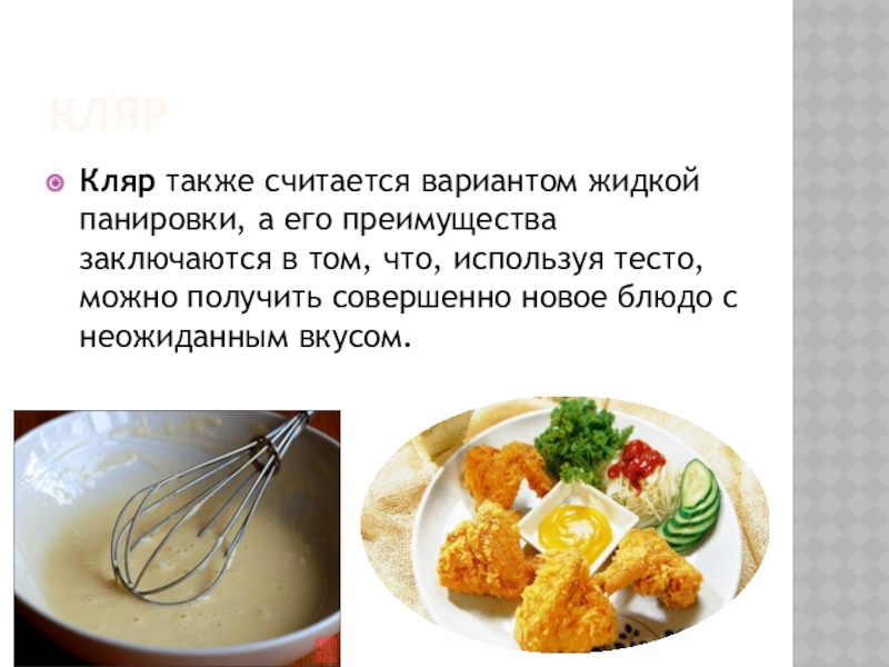 Кляр также считается вариантом жидкой панировки, а его преимущества заключаются в том,