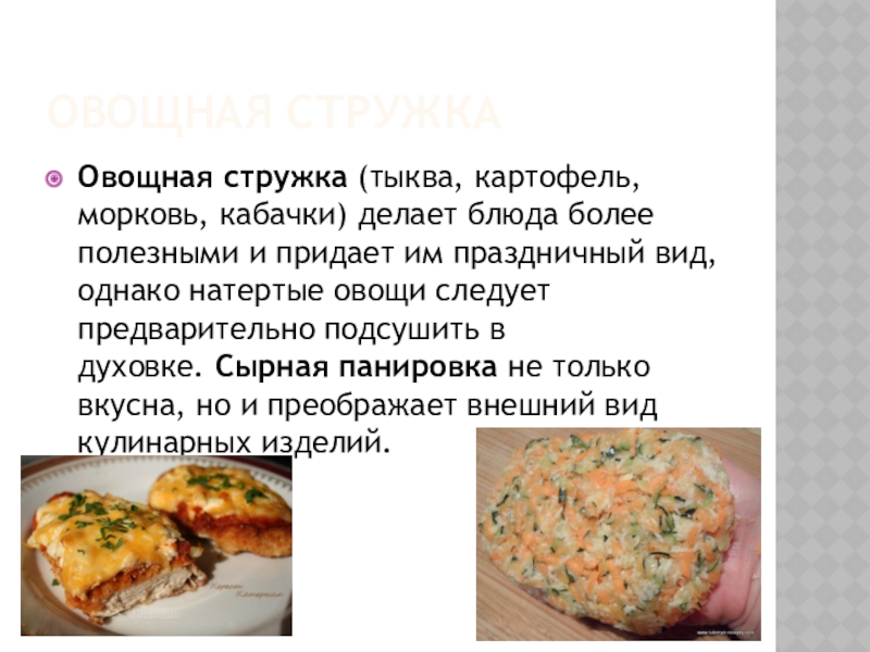 придает им праздничный вид, однако натертые овощи следует предварительно подсушить в духовке. Сырная панировка не только вкусна, но и преображает внешний вид кулинарных изделий.