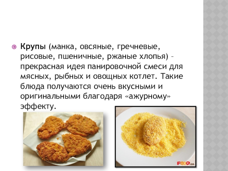 Слайд 17Крупы (манка, овсяные, гречневые, рисовые, пшеничные, ржаные хлопья) – прекрасная идея панировочной
