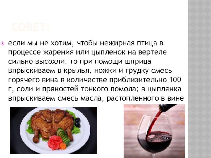 цыпленок на вертеле сильно высохли, то при помощи шприца впрыскиваем в крылья, ножки и грудку смесь горячего вина в количестве приблизительно 100 г, соли и пряностей тонкого помола; в цыпленка впрыскиваем смесь масла, растопленного в вине