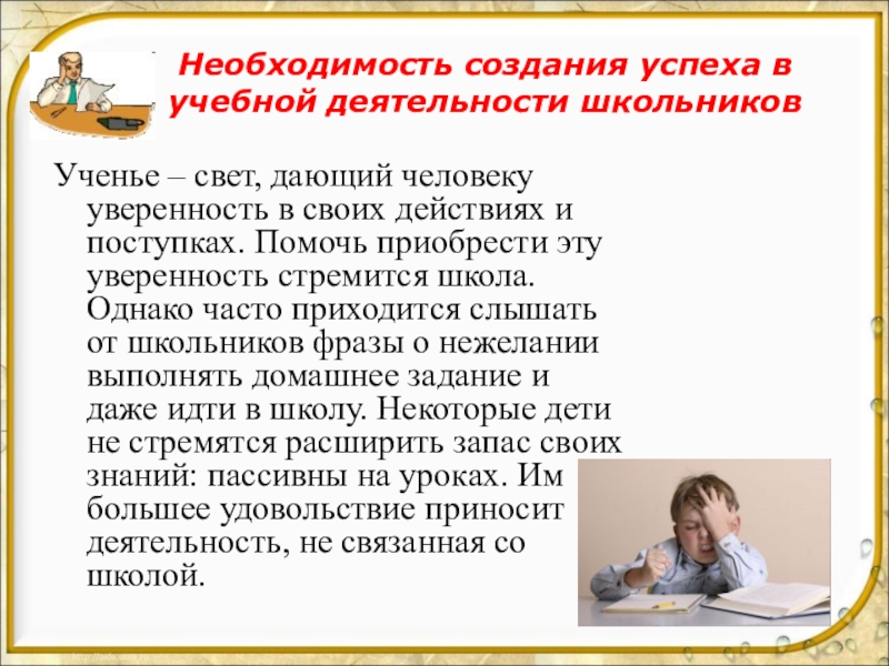 Слайд 8Необходимость создания успеха в учебной деятельности школьников