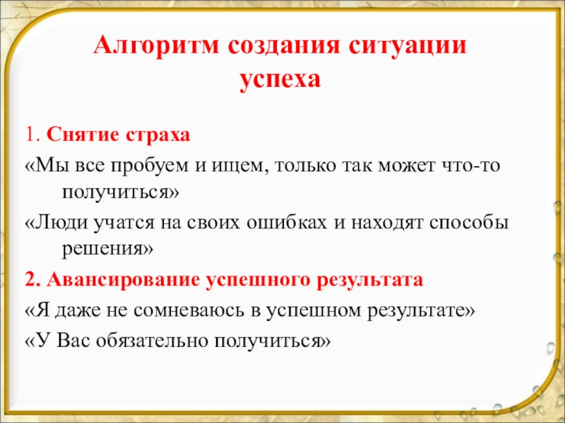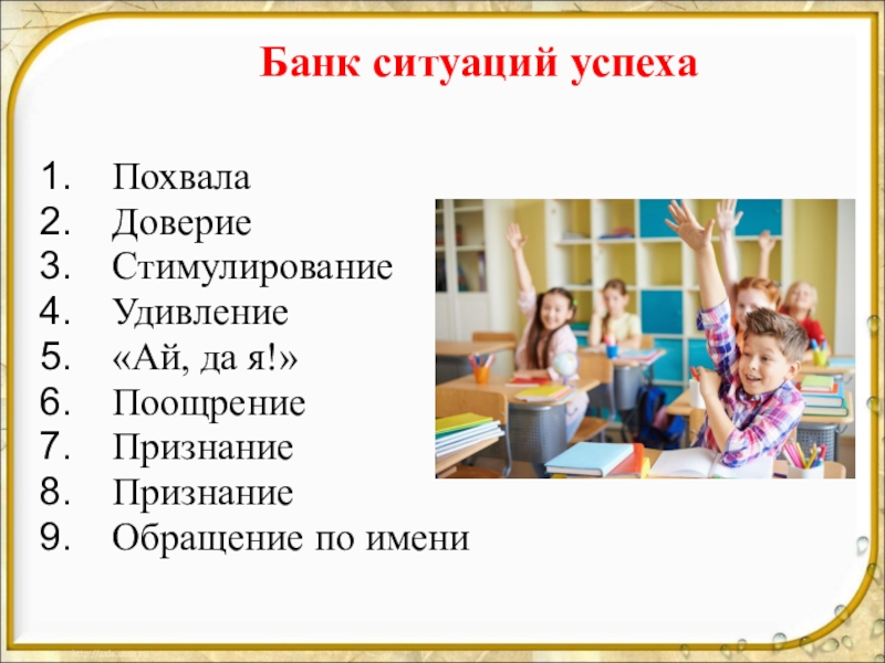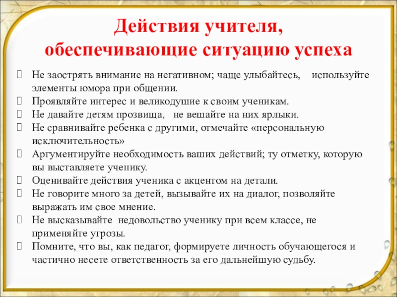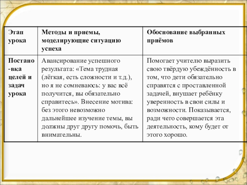 ситуацию успеха на уроке и дать ему возможность пережить радость достижения, осознать свои способности, поверить в себя.