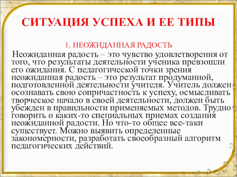 – это чувство удовлетворения от того, что результаты деятельности ученика превзошли его ожидания. С педагогической точки зрения неожиданная радость – это результат продуманной, подготовленной деятельности учителя. Учитель должен осознавать свою сопричастность к успеху, осмысливать творческое начало в своей деятельности, должен быть убежден в правильности применяемых методов. Трудно говорить о каких-то специальных приемах создания неожиданной радости. Но что-то общее все-таки существует. Можно выявить определенные закономерности, разработать своеобразный алгоритм педагогических действий.