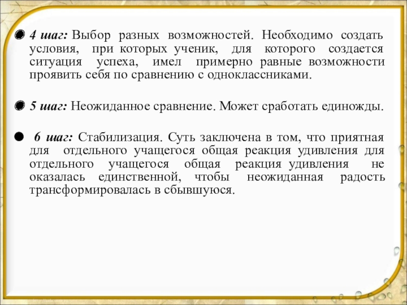 6 шаг: Стабилизация. Суть заключена в том, что приятная для отдельного учащегося общая реакция удивления для отдельного учащегося общая реакция удивления не оказалась единственной, чтобы неожиданная радость трансформировалась в сбывшуюся.