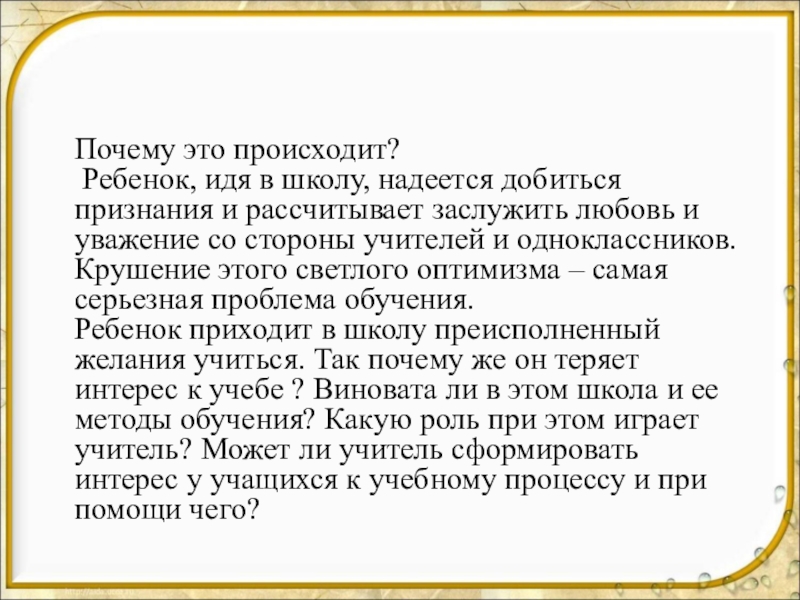 Ребенок приходит в школу преисполненный желания учиться. Так почему же он теряет интерес к учебе ? Виновата ли в этом школа и ее методы обучения? Какую роль при этом играет учитель? Может ли учитель сформировать интерес у учащихся к учебному процессу и при помощи чего?
